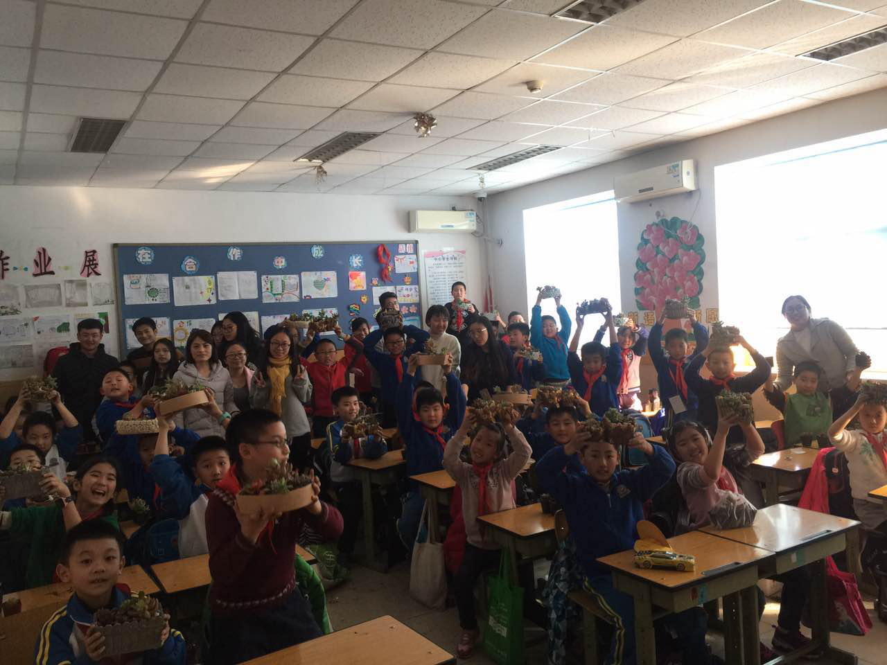 各党员同志积极配合,把花材、营养土、花盆以及配件发放给每位小同学。同时教他们不同的花盆如何搭配不同的多肉植物,体现不同形式的美感。小同学们将选好多肉植物,通过填土、搭配、组合和浇水等一系列过程,展现了他们的多肉作品。他们幸福的脸庞体现了对动手课的热爱以及对绿色植物的喜爱。