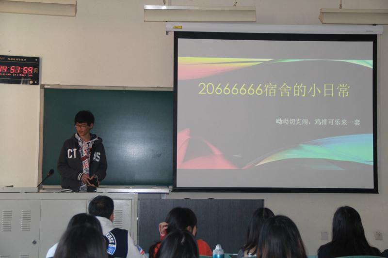 本次答辩顺序由推送投票结果决定,女生宿舍7号楼A213宿舍第一个进行答辩。精心准备的幻灯片讲述了装饰宿舍的过程以及在这个过程中她们之间感情的提升。随后上场的几个宿舍准备的答辩幻灯片也颇具特色,“静心阁”、“齐赋阁”等分别为她们宿舍的名字,均具有自己的深刻含义。不少宿舍还准备了自己的生活照、视频等,都是宿舍成员互相了解、关爱的见证。