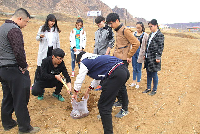 中午略作调整后,实践团便赶往种植地挖土取样。根据南关乡的需要选取了中药材,小番茄,西兰花等种植地,采用科学方法进行取土之后计划带回公司进行成分测量,从而分析数据提出对南关乡产品种植的建议。在取样期间,党支部的学长学姐们和县政府的李楠同志积极的交流了各村的耕种情况并思考解决方案。进行了思想的碰撞,也让实践团更加了解南关乡的需求。