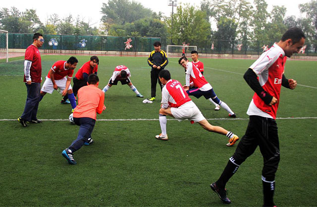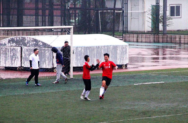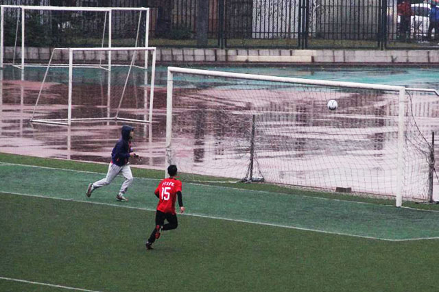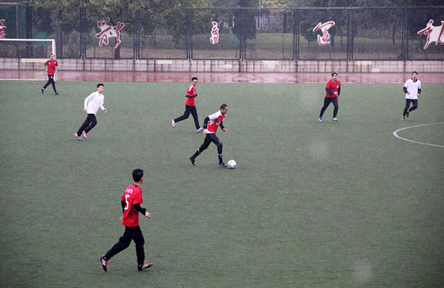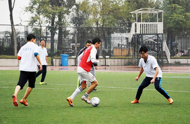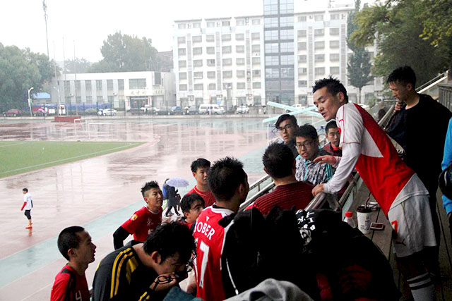 10月27日下午3点30分,MS88官方网站足球队与国际公司足球队在操场上举行了一场足球小组赛。3点左右,运动员们冒着风雨,在满是水洼的球场上开始热身。