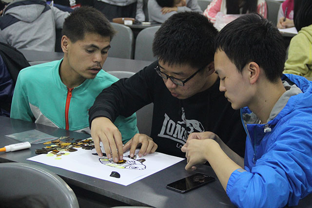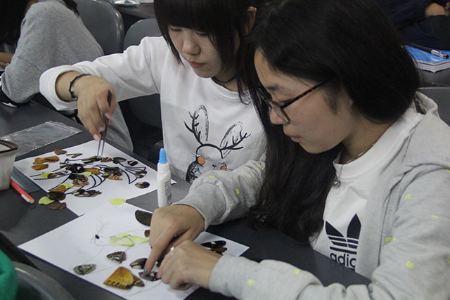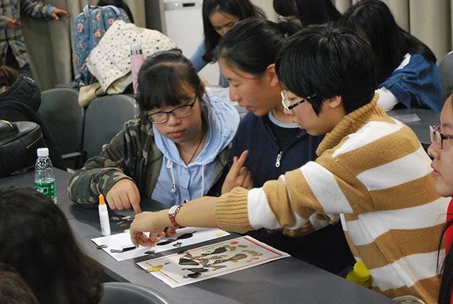 开场由15级的张璇,许佟为新生们系统介绍了蝶翅画的来历,制作方法与技巧。蝶翅画是以蝴蝶的翅膀为材料,利用其色彩、光泽以及纹理结构等特点,将形状、大小不同的翅坯粘贴在画板上而形成的手工工艺品,是MS88官方网站的特色产品。同学们沉醉其中,用心制作出了精美的艺术品:北农美景、北农校徽、北农特色,同学们的作品表达出他们对校园深深的热爱,对迎接北农60华诞的激动心情。