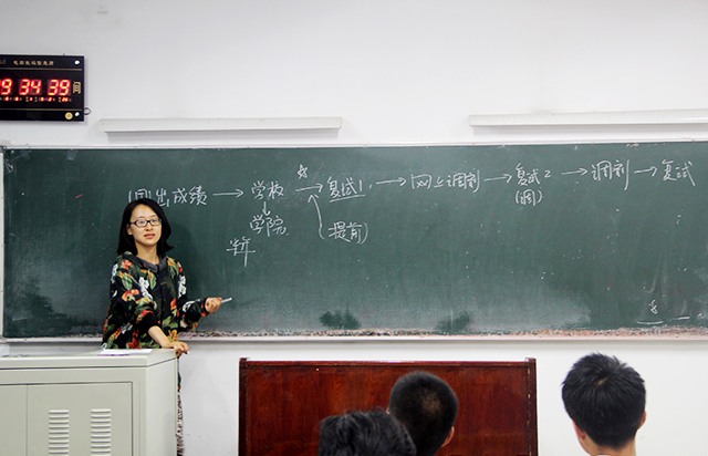 交流会开始,贡瑞明和陈控分别向在座的同学们介绍了考本校和考外校所需要注意的方面,在备考的过程中,不同学科的复习要采用不同的方法,强调专业课程的备考要勤问老师,还提醒同学们多询问有经验的学长学姐来了解更快捷的解题方法。陈控特别提到,目前很多公司都非常注重实践方面的考核,建议同学们复习理论知识的同时还要提高自己的实践能力。随后,张磊通过绘制考研流程图清楚的向大家介绍了调剂过程,并着重讲解了复试过程中时间公示,联系导师等方面的细节。最后,三位学长学姐向在座的同学答疑解惑,并针对个人提出了宝贵的建议。