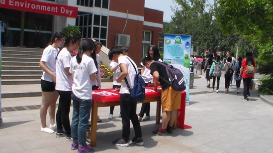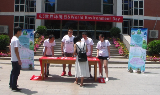 6月1日上午10点,农业资源与环境系本科生党支部成员全体身着宣传服在礼堂东门前集合,布置活动现场,挂起宣传海报和横幅。宣传活动开始,支部成员以宣传小组形式,向师生进行关于世界环境日和环境保护工作的宣传和讲解,介绍校园环保小常识,并号召师生在宣传横幅上写出自己关于环境保护的建议和想法,进行“环保从我做起”的签名征集。同时,党支部联系校团委,在礼堂广场大屏幕上连续播放了3天环保宣传片,播放时间为每天中午11:30-13:00,正值中午就餐时间,广场上人流量较大,起到了很好的“环境保护、从我做起”的宣传效果。