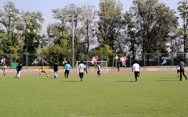 开场发球,两队实力不相上下,在比赛开始五分钟后植保打破僵局先进一球,为班级赢得一分,使球队士气大振。资环不甘落后,不久,前锋艾力夏提·艾克帕尔同学便发起反击,一路带球无人可挡,危急时刻植保守门员关山同学沉着应对,以过硬的实力拦截住了艾力夏提同学的猛攻,观众们呼声热烈,情绪高涨。