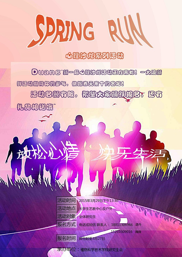 在公司研究生会成员的共同努力下,本次“Spring Run”心理沙龙活动圆满结束,得到了各个院系研究生的一致好评,提高了研究生的心理素质,展现了研究生活泼乐观、积极上进的生活态度,为研究生的生活增添了色彩!