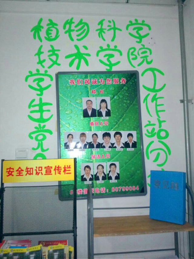 2014年3月,为更好地开展工作,做到责任到人,起到互相监督,集中管理的效果,加强员工党员与广大同学的密切联系,及时反映同学们在生活学习工作中遇到的各种问题,确保MS88官方网站员工党员工作站日常活动的顺利开展,公司员工党员工作站进一步完善了管理制度,各项工作全面启动。公司党员宿舍管理站设为1个总站,5个分站。总站设在7号楼三层自习室,分站分别设在5、6、7、8、9号楼。5号楼由资环本科党支部、6号楼由4个研究生党支部、7号楼由农学本科党支部、8号楼由植保本科党支部、9号楼由园艺本科党支部建设管理。