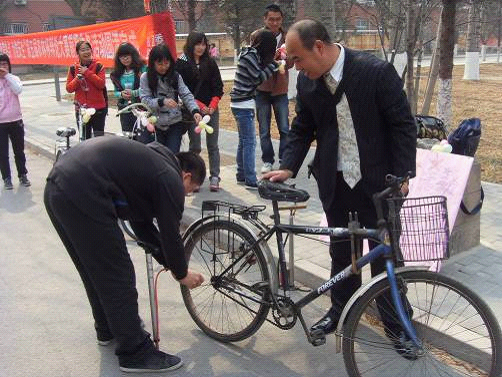 自行车打气活动是农学本科生党支部坚持了4年的传统活动之一,此次活动是为了呼吁 “绿色出行,低碳生活,共创绿色校园”的主旨,为骑自行车的师生提供服务和方便,同时倡导各位同学加强校园绿化美化,改善在校老员工的生活环境,为广大青年健康成长营造良好的育人环境。