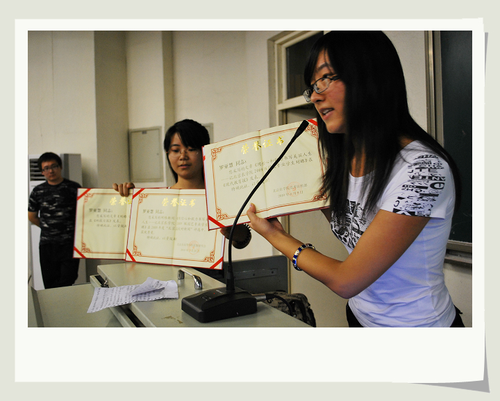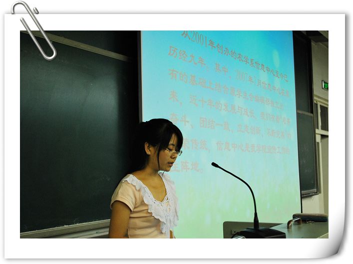 大会开始,信息中心副主任的安蔷声情并茂的向新生们介绍信息中心概况,各部门分布情况以及信息中心经过不断成长,不断进步所获得的成绩。接下来,分别由新闻部部长贾茜远、系刊部部长周英豪、技术部部长宋鹏通过精心制作的幻灯片和视频向2010级新生们介绍本部工作情况,曾举办的活动及近几年来取得的成绩,用最真挚的语言邀请新生们的加入。最后,由专题报告小组的记者罗亚慧向新生们讲述自己一年来的工作经验,从曾经的不入门到后来的写新闻屡获奖项,用自己真实的经历告诉新生们,不要因为自己一开始什么都不会而退却,因为通过在信息中心这个大家庭里的历练和成长,可以收获很多。