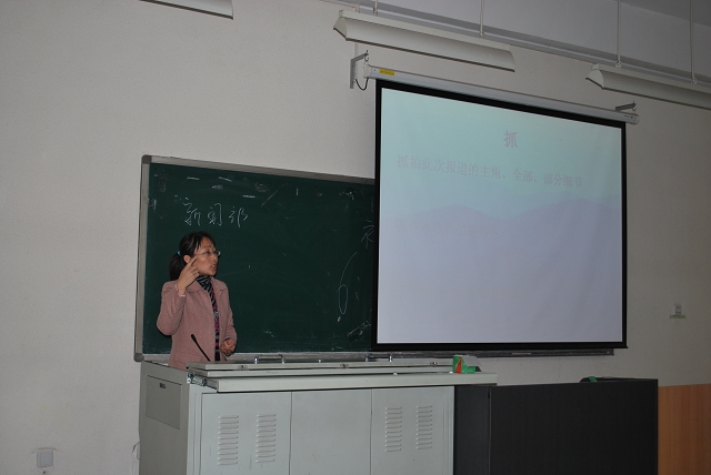 会上,贾老师首先向同学们讲解了什么是新闻?不同类别新闻的写作方式。接下着重讲解了如何才能写出好的新闻报道,贾老师用“抓、亮、细”三个字强调总结写出好新闻的经验,即要抓住别人抓不到的细节、拥有自己的工作亮点和工作中整个环节要做好精心细致的准备,并通过各种新闻实例充分诠释了这“三个字”的重要性。