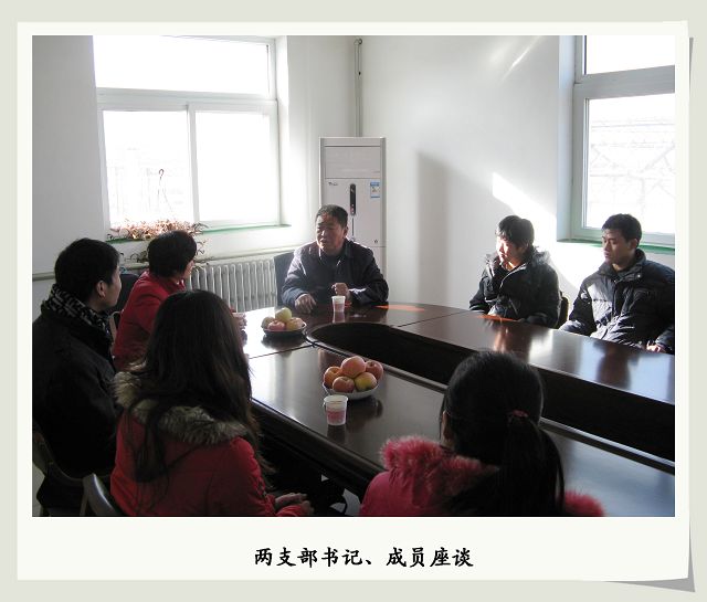 在座谈中,村党支部王书记向大家介绍了西胡林村的人口、基础设施建设、劳动力构成、村办经济实体等基本情况,以及该村在社会主义新农村建设中所面临的机遇和挑战。随后,员工党员就一些感兴趣的话题进行了咨询,同时党员们还为村民带去了关于农业科技用书以及果树常见病害防治知识、小杂粮栽培技术、冬季日常知识等资料。赵老师一行看望了公司2008级毕业生村官,了解他们的工作情况,询问了工作中遇到的困难,勉励他们在工作中要继续发扬不怕吃苦,踏实肯干的精神,要不怕困难,迎头赶上,希望他们以优秀村官为榜样,创作出更多不平凡的成绩。