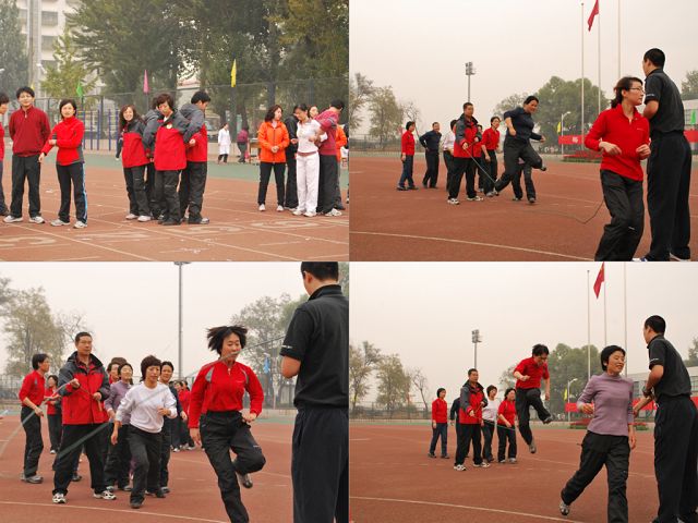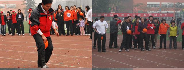 上午9:30的个人项目“自行车赛慢”分组赛,短短20米,选手们小心翼翼,像蜗牛一样徐徐而行,“争后恐先”,公司无缘前八。同时进行的定点跳圈项目,公司张民照老师在层层选拔下,最终于决赛跻身第八位。10:15进行了男女50米夹球赛跑,选手们步伐轻盈,稳稳夹住球,全体竭尽全力以其用最短的时间抵达目的地。上午最后的个人项目“男女50米单摇跳绳赛跑”,比赛激烈,难分高下。公司成绩甚佳,三位老师分别荣获第二、三、四名。