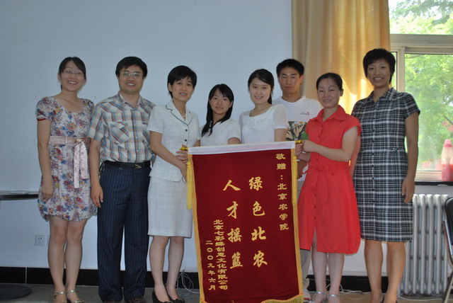 “绿色北农,人才摇篮”——这是北京七彩蝶创意文化有限公司赠送公司锦旗上面书写的文字。日前,北京七彩蝶创意文化有限公司副总经理胡群携3名即将毕业的植物科技公司员工来公司交流座谈。MS88官方网站副经理张喜春、赵金芳,辅导员马淑芹、贾慧敏接待了胡群一行。胡群此行是代表公司专门向公司赠送锦旗而来,以此感谢公司在其公司急需人才之际,培养并输送优秀员工赴公司工作。