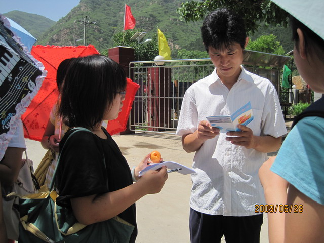 北京市平谷区南独乐河镇北寨村被誉为中国“红杏第一村”,拥有百年红杏栽培历史,是远近闻名的红杏之乡。此次活动时值北寨村第八届“北寨红杏采摘节”开幕,第三党支部组织全体成员到北寨村进行志愿服务,为“北寨红杏采摘节”奉献一份力量。其中两组成员,一组进行交通巡逻志愿服务,另一组对此次北寨红杏采摘节做了相关调查。结合调查,支部成员和村官进行了沟通交流,以便于及时准确的解决杏农的实际问题。之后全体成员又在北寨人投资建设的人工湖周围组织开展清理垃圾工作,并向游客进行环保宣传活动。
