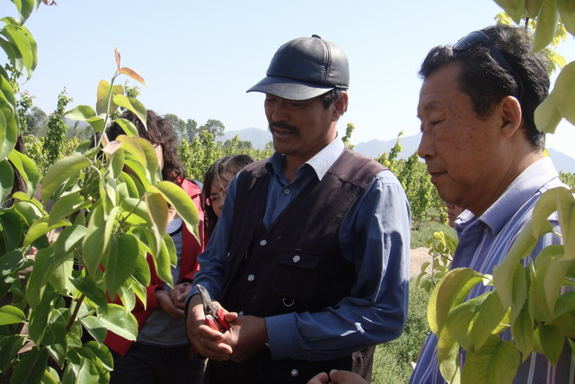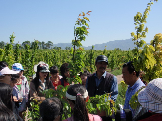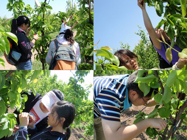 当天抵达目的地后,果园的吴经理热情接待了大家。休息片刻后,吴经理开始简单介绍了阳光果园的发展和现状,之后走进梨园,进行现场疏果技术指导。天气虽然很热,但大家听得很认真,遇到修剪的重点和注意问题,有的同学会记录在本子上,对于不清楚的操作细节,同学们也都抓紧时间向老师和吴经理请教。待吴经理讲解完毕,便分发剪刀,2人一组,行动起来,每组的任务是完成一排将近60株的疏果工作。