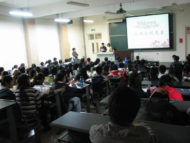 竞赛以班级为单位分为七小组,每小组选派三名同学为代表参加,班级同学现场加油并补充作答。比赛分为四个环节进行。第一环节“有问必答”,每小组随机抽取10个问题,可以商讨,在此环节中选手们齐心协力,充分体现了团队协作精神,都取得了较为满意的分数。第二环节“争分夺秒”,即在规定时间内快速回答问题。此环节选手竞争激烈,观众反应热烈,而观众活动环节采用击鼓传花的方式回答关于校规校纪的问题,更是深受同学们的欢迎;最后的“一锤定音”更是使现场的气氛达到了最高点,不仅场上答题同学十分紧张,场下的人也是一样。辅导员马淑芹老师还针对个别易混淆、难懂的校规校纪进行了举例讲解,使同学们对校规校纪有了更为深入的理解。