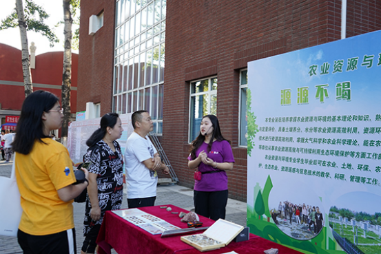 农学专业的主题是“助力农业发展、培养新型人才”,介绍该专业的培养方向,并设置了答题获得棉花种子的互动。农业资源与环境专业的讲解员介绍了该专业的学习内容及就业方向,并在展区陈列各种矿石标本以及取土器等具有学科特色的专业仪器。