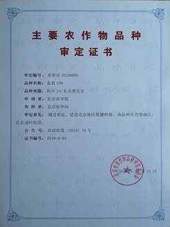 “北农109”为黑大豆品种,种皮黑色、子叶绿色、椭圆粒、百粒重30.9g;粗蛋白质44.4 %、粗脂肪17.26 %;两年区试平均亩产162.1公斤,生产试验平均亩产114.1公斤,是北京市第一个审定通过的黑大豆品种。