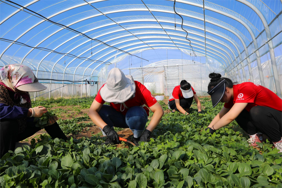 在园区专供婴幼儿食用“宝宝菜”温室,在技术员的指导下,实践团成员学习了“宝宝菜”的种植技术,并按照企业标准协助工作人员进行采收。
