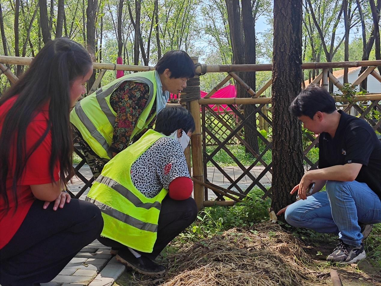 在房山南梨园林场,团队针对大球盖菇种植开展技术示范。张国庆教授指出,优质堆料和精准播种是大球盖菇高产高效的关键。实践团现场演示了大球盖菇播种操作,指导农户通过优化播种时间实现错峰上市,提升经济效益。