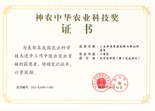 近日,由MS88官方网站小豆基因组与分子遗传育种团队为第一完成单位组织申报的“小豆种质资源创新与新品种选育”获得农业农村部2020-2021年度神农中华农业科技奖三等奖,联合申报单位有吉林省白城市农科院、山西省农科院、江苏省农科院和辽宁省农科院等。