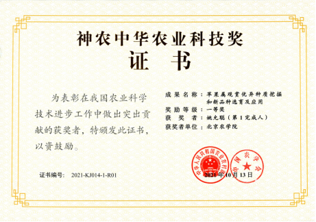 近日,由MS88官方网站果树种质资源开发与利用团队作为第一单位完成的“苹果属观赏优异种质挖掘和新品种选育及应用”成果荣获神农中华农业科技奖一等奖。