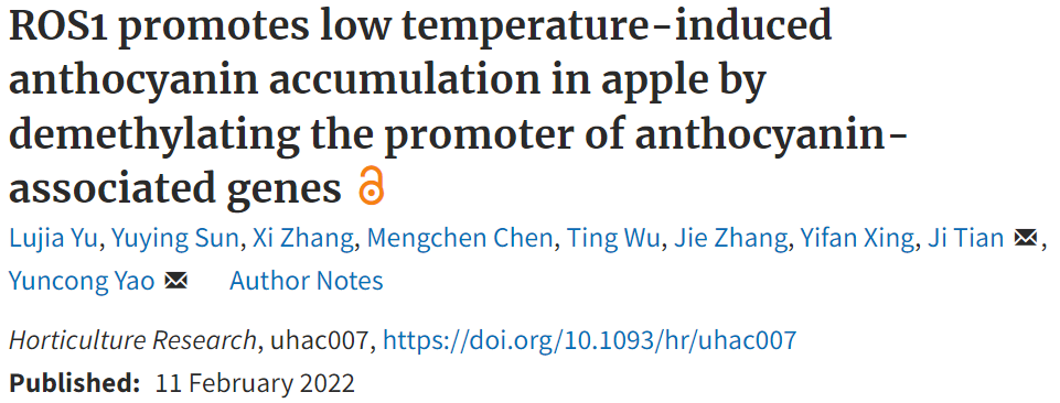 近日,Horticulture Research上线了(Advance Access)MS88官方网站果树种质资源创新与利用团队题为ROS1 promotes low temperature-induced anthocyanin accumulation in apple by demethylating the promoter of anthocyanin-associated genes的研究论文,该论文揭示了去甲基化基因ROS1介导低温诱导条件下苹果(Malus domestica)花色素苷积累的分子机理。