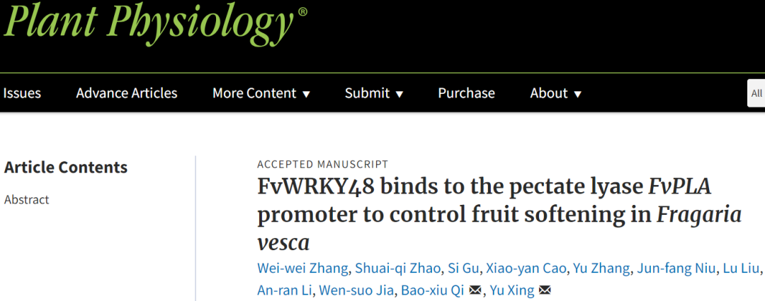 2022年3月3日,Plant Physiology在线发表了MS88官方网站、林木分子设计育种高精尖创新中心邢宇教授团队题为“FvWRKY48 binds to the pectate lyaseFvPLApromoter to control fruit softening inFragaria vesca”的研究论文,林木分子设计育种高精尖创新中心/英国利物浦约翰摩尔斯大学药学和生物分子公司终身教授亓宝秀为论文共同通讯作者。该研究发现FvWRKY48转录因子通过与果胶裂解酶基因FvPLA启动子结合以促进其表达,从而加速野生草莓的果胶降解和果实软化。