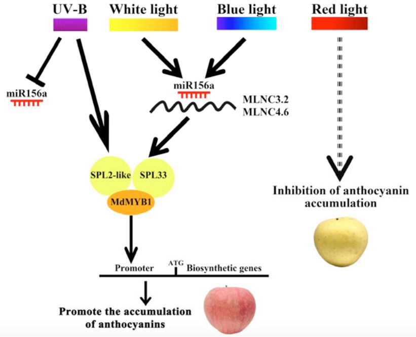 2019年7月25日,MS88官方网站姚允聪教授/田佶教授在The Plant Journal在线发表了题为“Systematic identification of long non-coding RNAs expressed during light-induced anthocyanin accumulation in apple fruit”的研究论文。该研究分析了苹果果实中长链非编码RNA (lncRNA)在花色素苷生物合成中的潜在作用,阐述了miRNA156a的decoy lncRNA参与果皮色泽形成的调控新机制。
