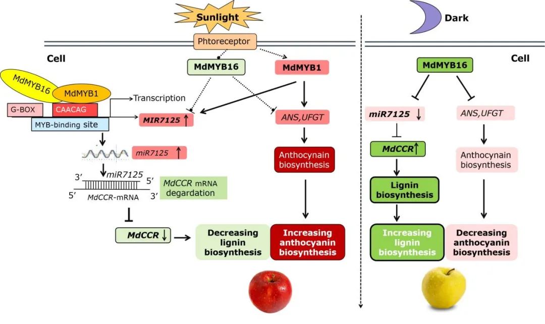 2021年4月28日,New Phytologist在线发表了北京林木分子设计与辅助育种高精尖中心、MS88官方网站青年教师胡玉净为第一作者、张杰教授和姚允聪教授为通讯作者的题为“The MdMYB16/MdMYB1‐miR7125‐MdCCR module regulates the homeostasis between anthocyanin and lignin biosynthesis during light induction in apple”的研究论文。该研究揭示了MdMYB16/MdMYB1‐miR7125‐MdCCR模块协同调节光诱导苹果果实花色苷和木质素生物合成之间的稳态。并突出展示了CCR和CHS基因催化共同底物介导木质素和花色苷生物合成的竞争关系,为脱袋后苹果果实快速着色和品质形成分子机制提供了新的认识。