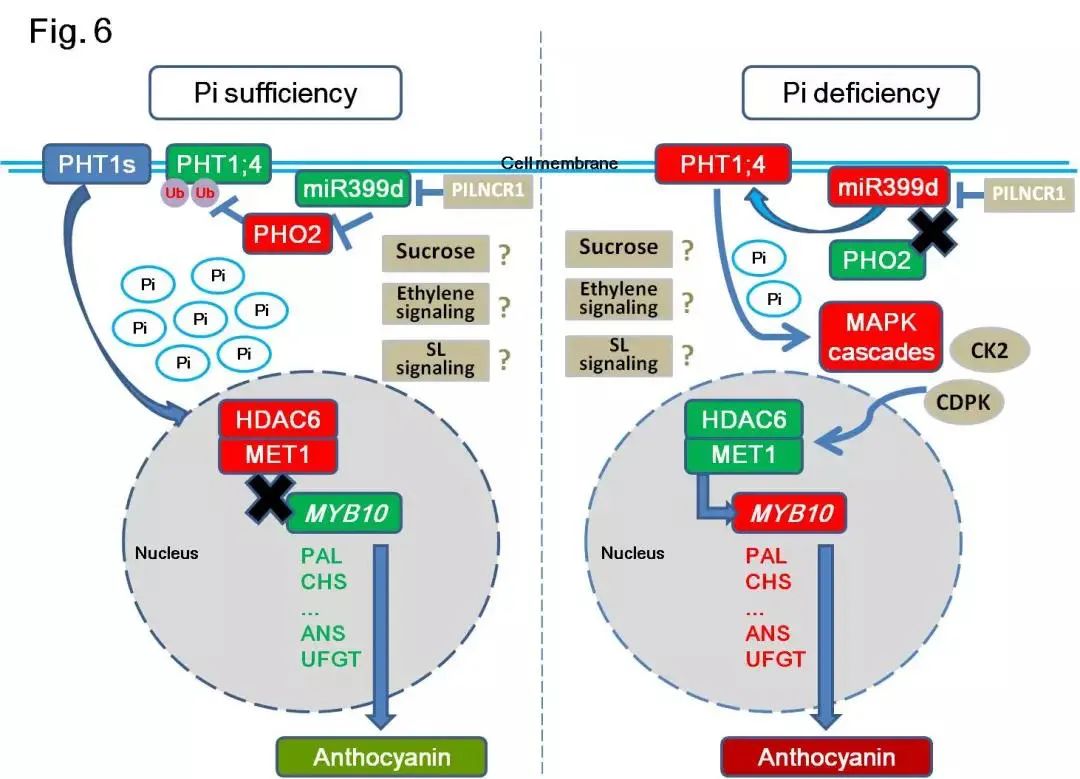 2019年12月13日,Plant Cell and Environment杂志在线发表了MS88官方网站姚允聪课题组题为“MiR399d and epigenetic modification comodulate anthocyanin accumulation in Malus leaves suffering from phosphorus deficiency”的研究论文。该研究揭示了miR399d、HDA6和MET1共同调控的苹果属叶片缺磷胁迫下花色苷积累的分子机制。