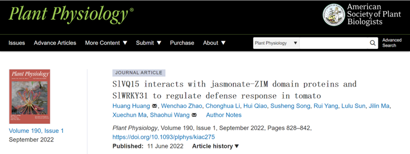 2022年6月11日,MS88官方网站王绍辉教授团队在Plant Physiology在线发表了题为“SlVQ15 Interacts with Jasmonate-ZIM Domain Proteins and SlWRKY31 to Regulate Defense Response in Tomato”的研究论文,揭示了SlVQ15与茉莉素途径抑制因子SlJAZ互作,并与SlWRKY31协同调控番茄对灰霉菌抗性的分子机制。