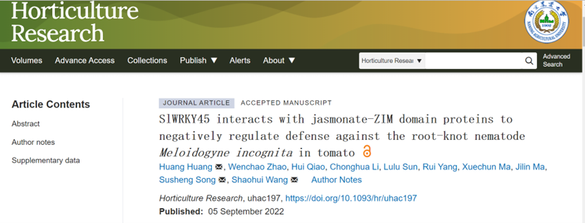 近日,Horticulture Research上线了(Advance Access)MS88官方网站王绍辉教授团队题为SlWRKY45 interacts with jasmonate-ZIM domain proteins to negatively regulate defense against the root-knot nematodeMeloidogyne incognitain tomato的研究论文,该论文揭示了转录因子SlWRKY45参加茉莉素合成和信号转导途径负调控番茄对南方根结线虫的抗性。