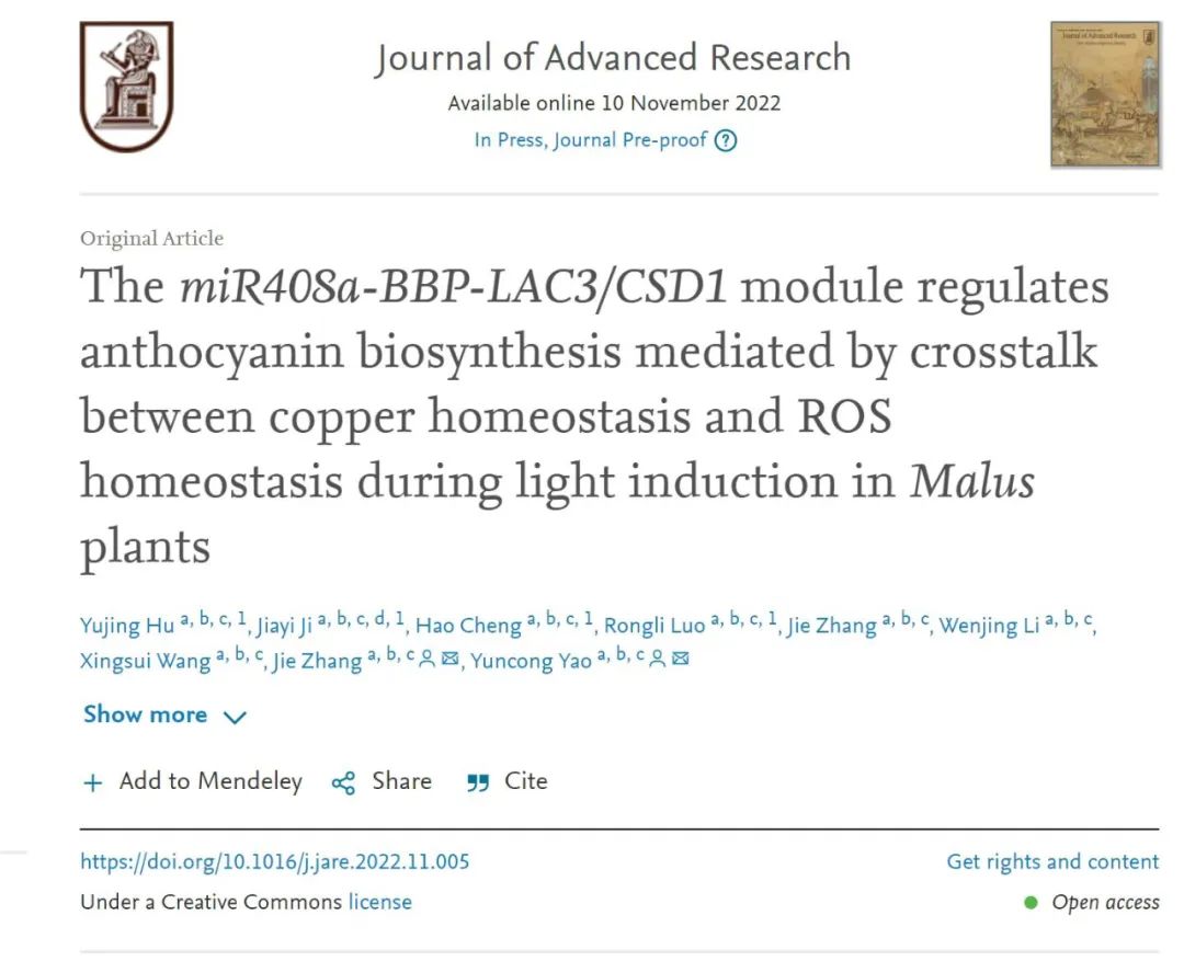 2022年11月10日,Journal of Advanced Research(IF=12.822)在线发表了北京市林木分子设计与辅助育种高精尖中心、MS88官方网站园艺学科撰写的题为“The miR408a-BBP-LAC3/CSD1 module regulates anthocyanin biosynthesis mediated by crosstalk between copper homeostasis and ROS homeostasis during light induction inMalusplants”的研究论文。