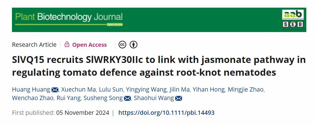 近日,MS88官方网站王绍辉/赵文超教授团队、首都师范大学宋素胜教授团队在Plant Biotechnology Journal发表了题为“SlVQ15 recruits SlWRKY30IIc to link with jasmonate pathway in regulating tomato defence against root-knot nematodes”的研究论文。该论文揭示了SlVQ15招募转录因子SlWRKY30IIc,偶联茉莉素途径调控番茄应对根结线虫入侵的分子机制,为茄科植物的抗性育种提供新的思路。