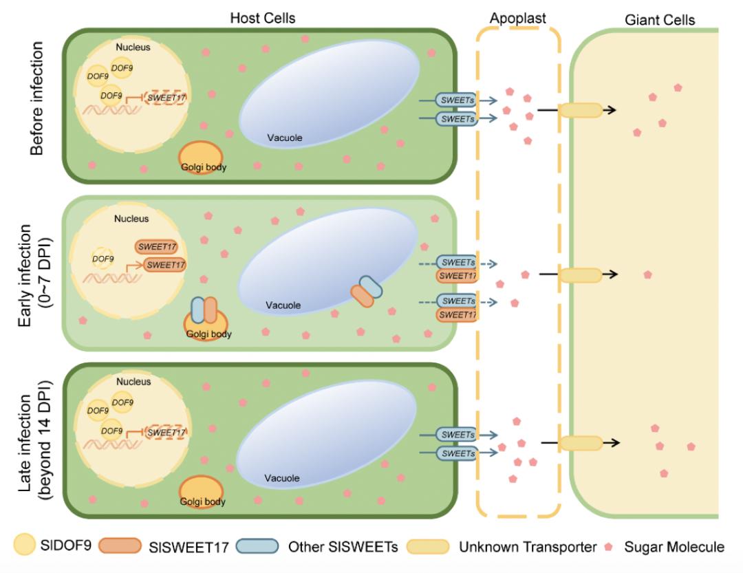 最后,研究人员提出了SlDOF9-SlSWEET17模块作为“分子开关”在根结线虫侵染全过程中的动态调控规律,分为三个关键阶段:正常条件下:SlDOF9与SlSWEET17维持基础表达水平。此时,SlDOF9通过结合SlSWEET17启动子并抑制其表达,允许其他高活性糖转运蛋白(如SlSWEET1c、SlSWEET1e等)正常向根部质外体运输糖分,保障植物自身生长所需的营养分配平衡,同时避免过度防御消耗自身能量;侵染早期(0-7天):当线虫侵入根系并开始诱导根结形成时,SlDOF9表达量迅速下调,解除对SlSWEET17的转录抑制。此时SlSWEET17蛋白通过与其他高活性SWEET蛋白结合,形成异源二聚体,降低后者的糖转运能力。这一“蛋白互作刹车”机制可有效减少糖分向根结富集,通过“饥饿战术”抑制线虫幼虫发育,为植物启动免疫反应争取时间;侵染后期(14天以后):随着根结线虫进入寄生稳态阶段,此时SlDOF9的表达量回升,重新抑制SlSWEET17转录,释放被封锁的高活性SWEET蛋白。尽管这为线虫提供了部分糖分营养,但避免了根系长期糖剥夺导致的发育障碍,体现了植物在抵御病原与维持自身生存之间的“策略性妥协”。
