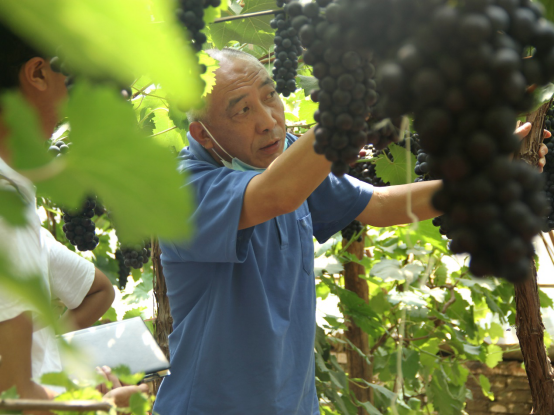 随后,实践团来到了当地的振兴合作社,参观了当地的设施葡萄种植基地。经该合作社高级工程师李经理的讲授,该地将“夏黑”葡萄品种重点培育,采用极短式枝条修剪技术及嫁接苗的方式,保证了该品种较高的结果率及葡萄甜度,且大棚中采用防虫网,避免了虫害的干扰,使得葡萄果实质量大大提高。由于当地干旱的气候条件,故当地村民采用了洼地的建棚模式,使大棚水平面低于地面水平面,将雨水的利用率提高,从而提高该地葡萄产量及质量。张卿老师、王志忠老师对于葡萄的种植、嫁接、修剪等技术进行了现场教学。