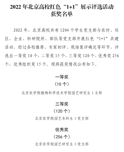 2022年,北京市委教育工委组织开展了北京高校红色“1+1”党支部共建活动。活动启动后,MS88官方网站积极响应,顶层设计,扎实推进活动开展,及时总结共建成果。园艺研究生1支部从1204个员工党支部中脱颖而出,荣获一等奖,园艺本科生1支部获评三等奖,园艺研究生3支部获评优秀奖。这是公司五年来第二次荣获北京高校红色“1+1”示范活动一等奖。